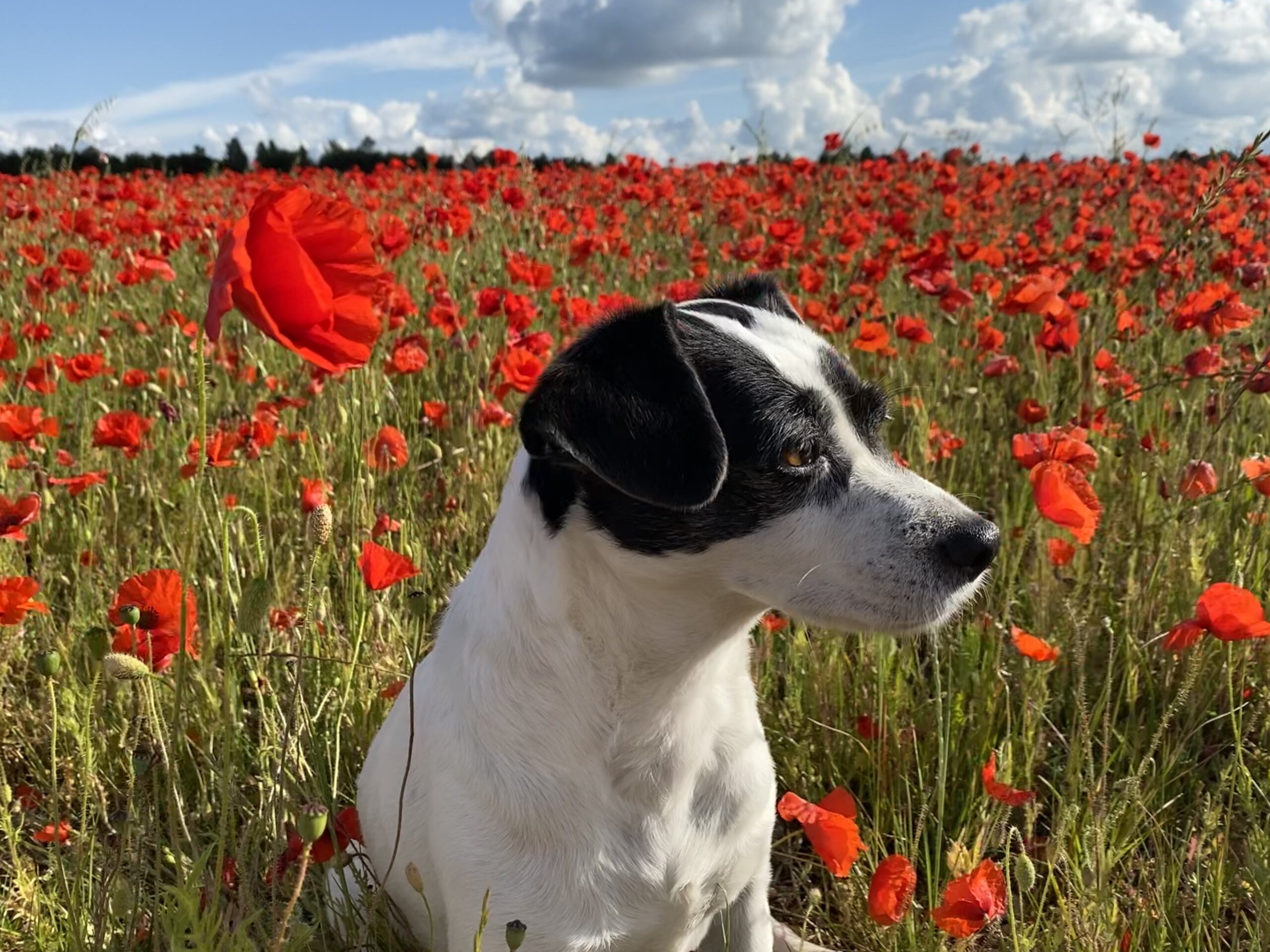 A Pinterest Pin with a photo of my dog Suki in a field of poppies.
